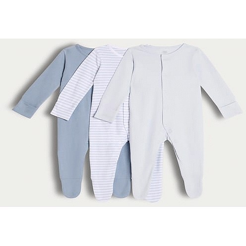 3-Pack Pure Cotton Long Sleeved Sleepsuits in Blue