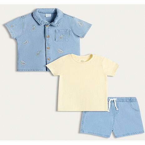 3-Piece Pure Cotton Embroidered Shirt and Shorts Set in Blue