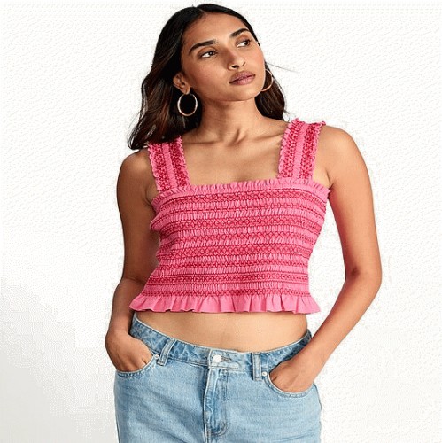 Pure Cotton Shirred Sleeveless Crop Top in Pink