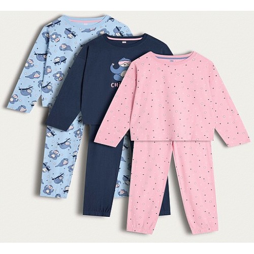 Girls 3-Pack Pure Cotton Printed Pyjama Set in Blue Multi