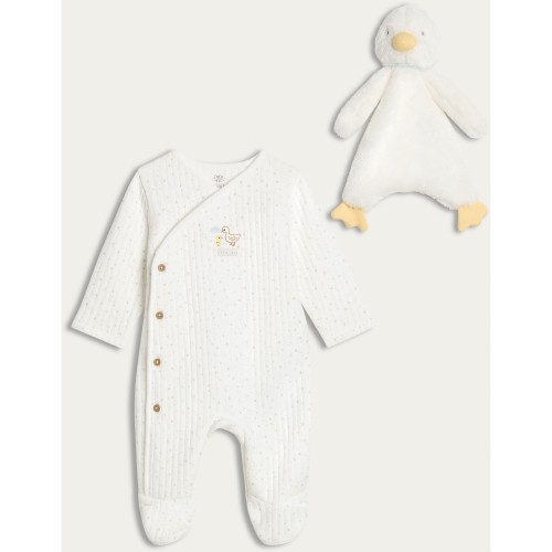 Pure Cotton Duck Print Sleepsuit and Comforter Set in White