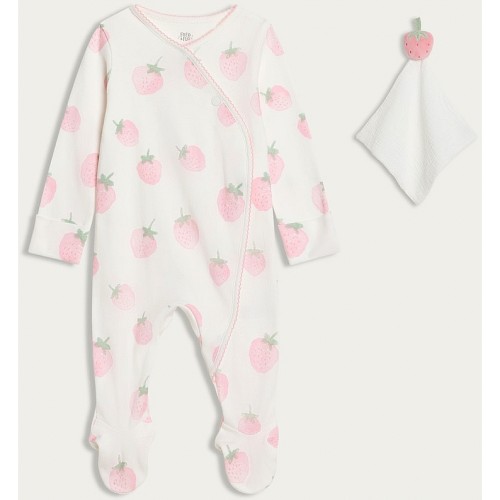 Pure Cotton Strawberry Print Sleepsuit with Comforter in White
