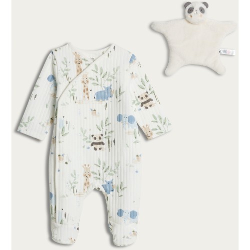 Pure Cotton Quilted Animal Print Sleepsuit and Panda Comforter Set in White