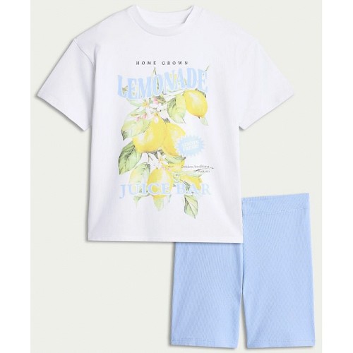 F&F Girls Pure Cotton Lemonade T-Shirt and Shorts Set in Multi White