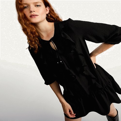 Ruffle Detail Tie Neck Mini Dress in Black