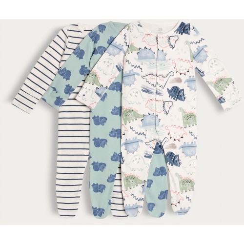 3-Pack Pure Cotton Dinosaur Sleepsuits in Blue