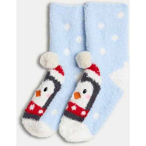 Girls Fluffy Penguin Cosy Socks in Blue Multi