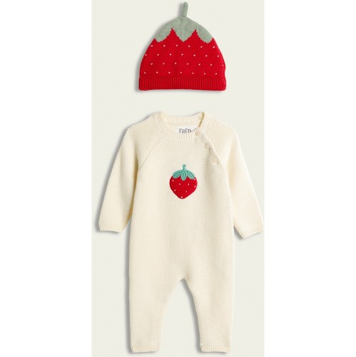 2-Piece Pure Cotton Knitted Strawberry Romper and Hat Set in White