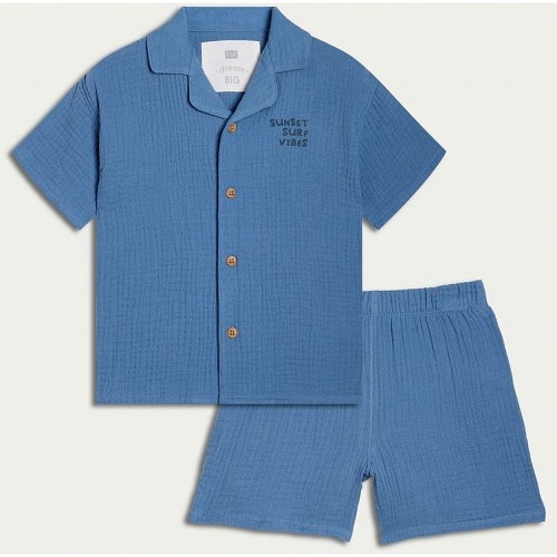 Boys 2-Piece Pure Cotton Surf Vibes Shirt and Shorts Pyjama Set in Blue