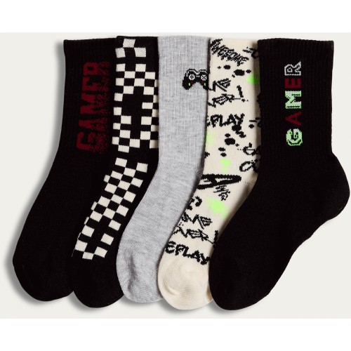 Boys 5-Pack Cotton Rich Gamer Print Ankle Socks in Multi