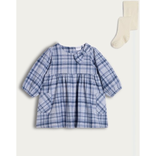 Brushed Check Print Dress and Tights Set in Blue