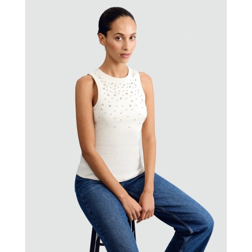 Cotton Blend Diamante Embellished Vest in Cream