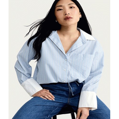 Cotton Rich Striped Contrast Collar Oversized Fit Shirt in Blue
