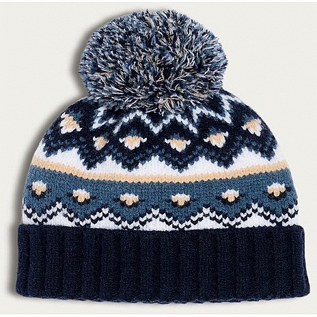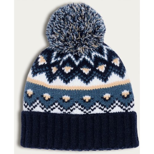 Boys Knitted Fair Isle Pattern Pom Pom Beanie Hat in Navy