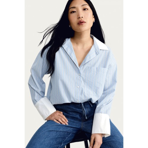 Cotton Rich Stripe Print Contrast Collar Oversized Fit Shirt in Blue