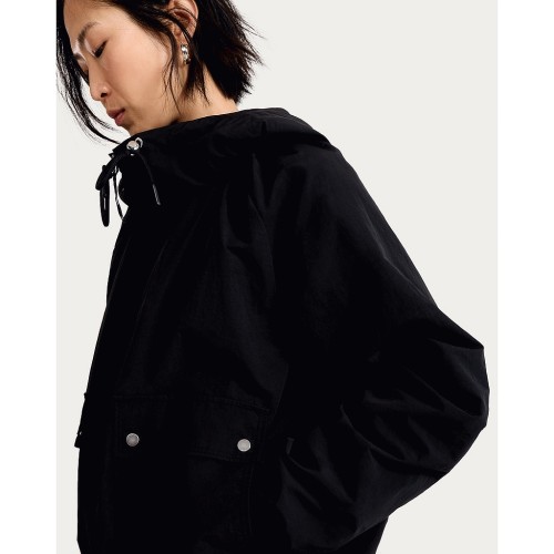 Drawstring Hem Hooded Shower Resistant Zip Up Jacket in Black