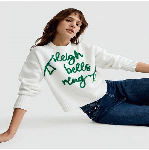 Knitted Sleigh Bells Ring Slogan Jumper in Cream
