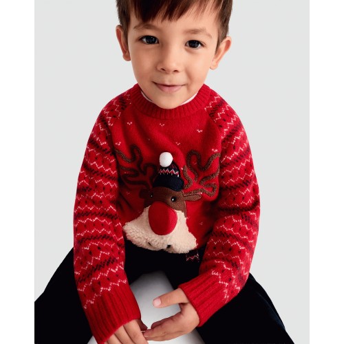 F&F Boys Knitted Reindeer Christmas Print Light Up Jumper in Red