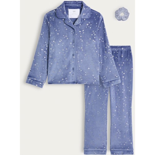 Girls Minky Textured Star Print Scrunchie Pyjama Set in Navy