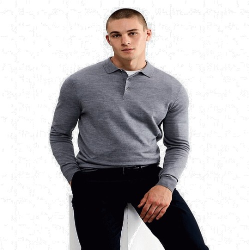 Pure Merino Wool Long Sleeved Polo Shirt in Grey Marl