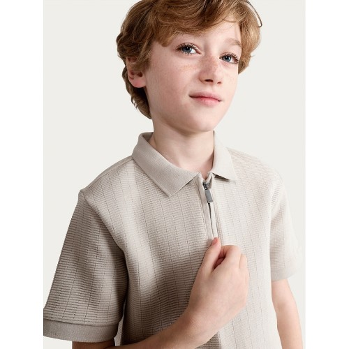 F&F Boys Cotton Rich Textured Zip Neck Polo Shirt in Stone