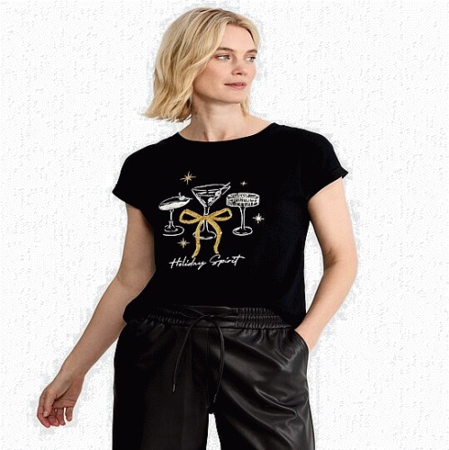 Pure Cotton Holiday Spirit Cocktail Print T-Shirt in Black