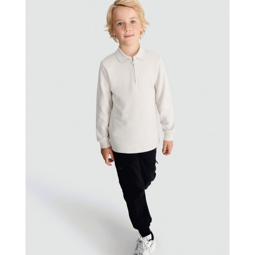 F&F Boys Pure Cotton Waffle Textured Long Sleeved Polo Shirt in Med Nude