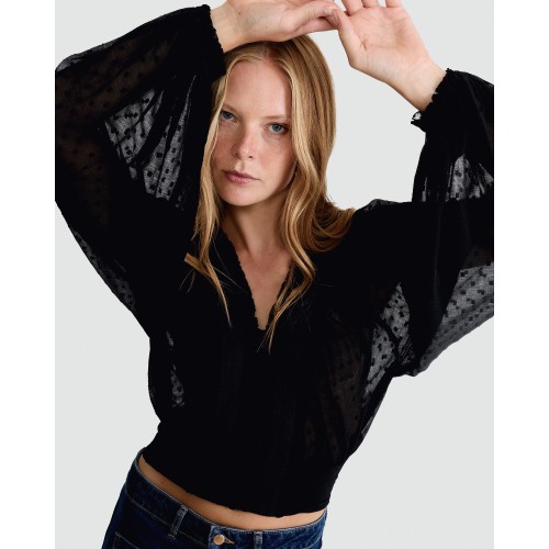 Chiffon Dobby Velvet V Neck Blouse in Black