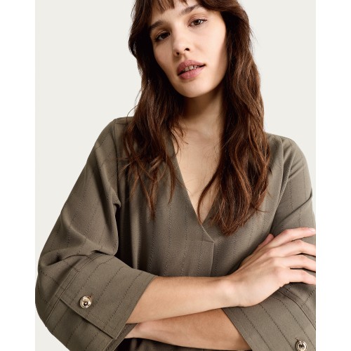 V Neck Button Cuff Blouse in Khaki