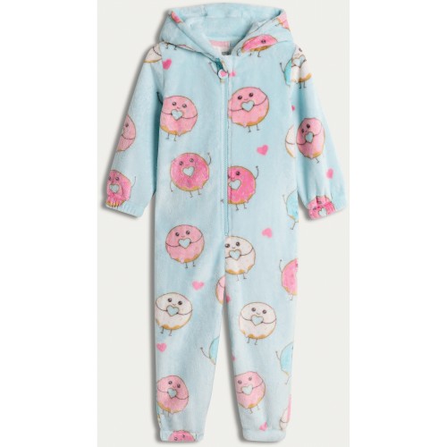 Girls Fleece Donut Print Hooded Onesie in Blue Multi