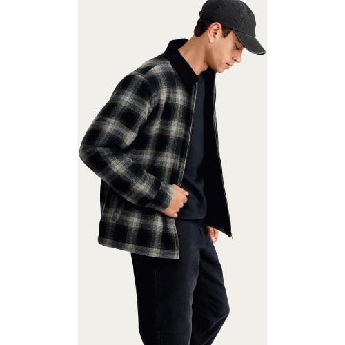 Check Print Borg Lined Zip Up Jacket in Black