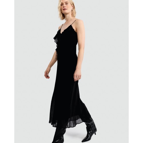 V Neck Ruffle Front Strappy Midi Dress in Black
