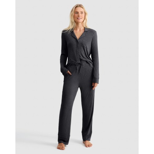 CoolEase Ribbed Button Up Shirt and Bottoms Pyjama Set in Black
