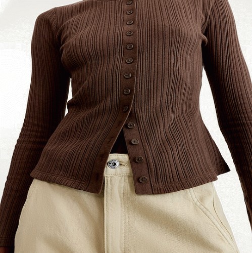 Cotton Rich Ribbed Button Up Cardigan in Brown