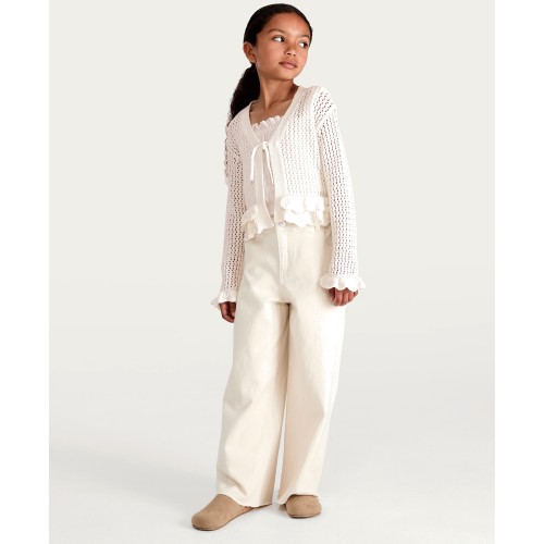 F&F Girls Cotton Rich Ruffle Hem Open Knit Cardigan in Cream