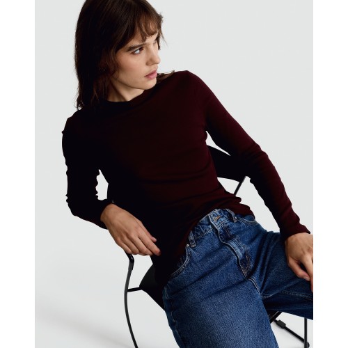 Cotton Rich Crew Neck Long Sleeved Top in Burgundy