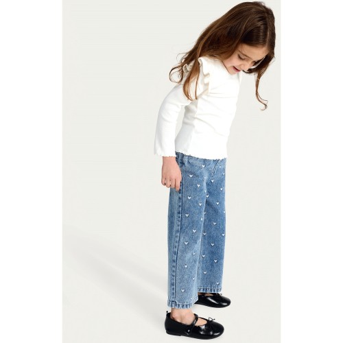 F&F Girls Pure Cotton Heart Embroidered Wide Leg Jeans in Blue