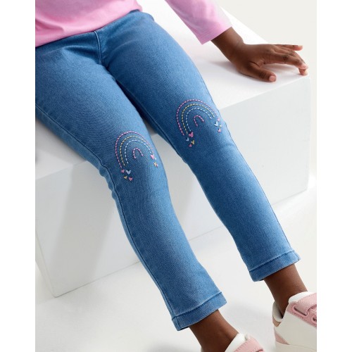 F&F Girls Cotton Rich Rainbow Embroidered Denim Jeggings in Blue