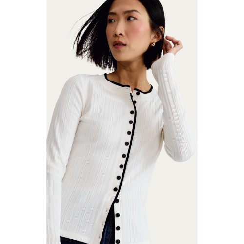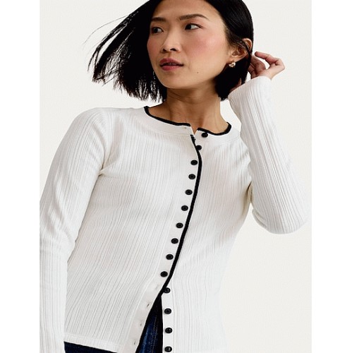 Cotton Rich Ribbed Contrast Trim Button Up Cardigan in Cream