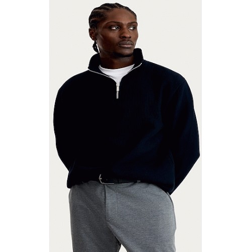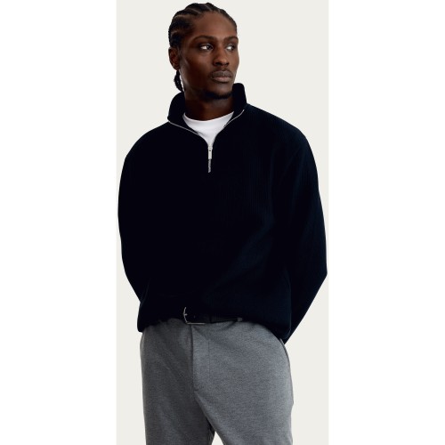 Cotton Rich Ribbed High Neck Half Zip Sweatshirt in Navy