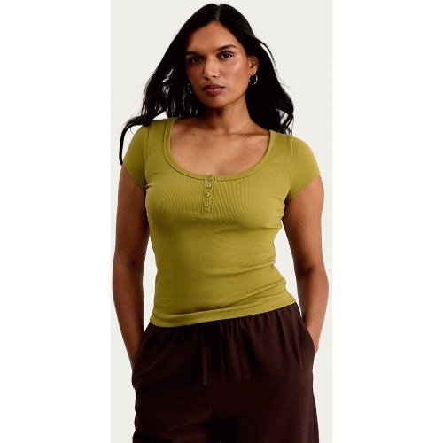 Cotton Rich Ribbed Scoop Neck Buttoned T-Shirt in Olive