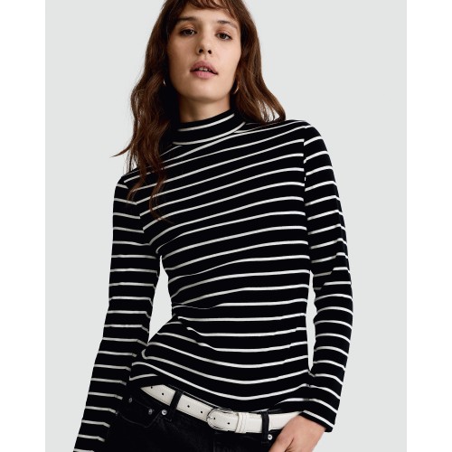 Cotton Rich Stripe High Neck Top in Multi Black White