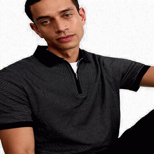 Cotton Rich Stripe Print Zip Neck Short Sleeved Polo Shirt in Black