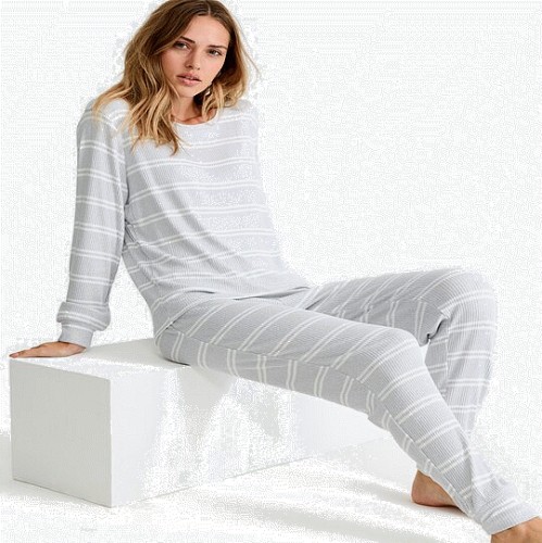 Ribbed Stripe Print Long Sleeved Top and Joggers Pyjamas in Grey
