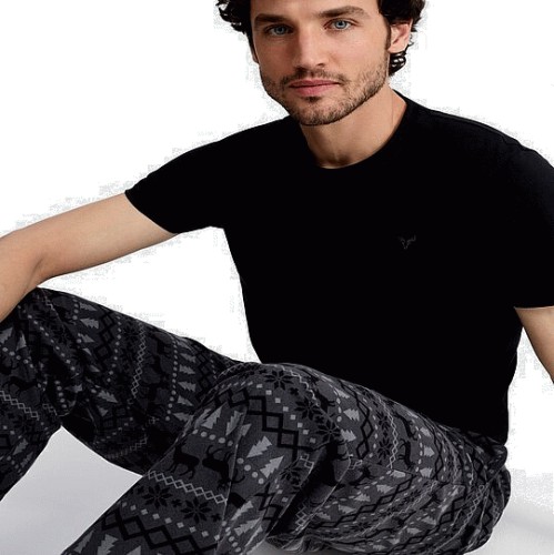 Pure Cotton T-Shirt and Fleece Patterned Pants Pyjamas in Black