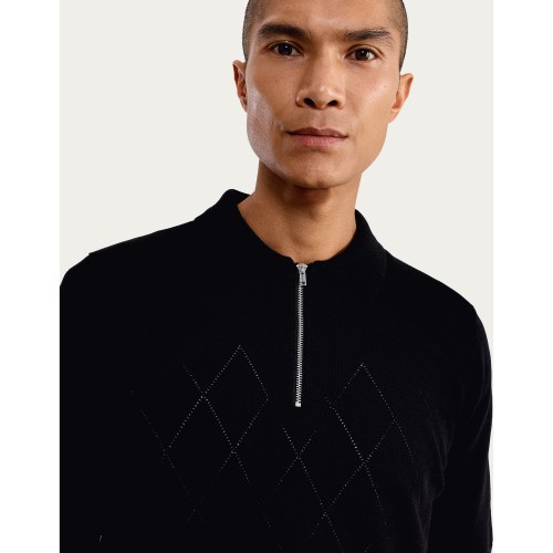 Cotton Rich Argyle Knit Short Sleeved Polo Shirt in Black