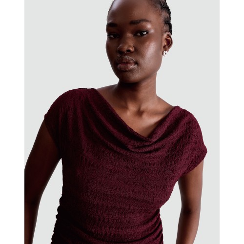 Textured Cowl Neck Cap Sleeved Co-ord Top in Burgundy