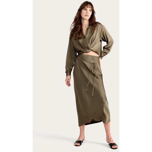 Satin Twist Front Hem Button Up Co-ord Shirt in Khaki