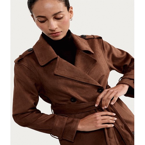 Faux Suede Double Breasted Longline Trench Coat in Brown