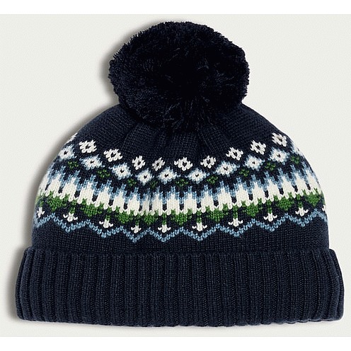 Knitted Fair Isle Fleece Lined Pom Pom Beanie in Navy